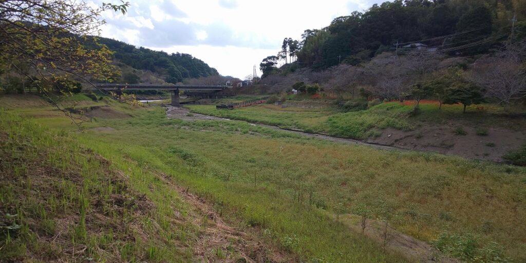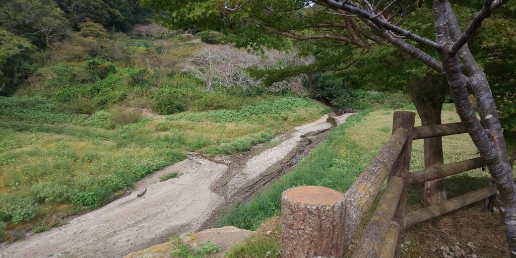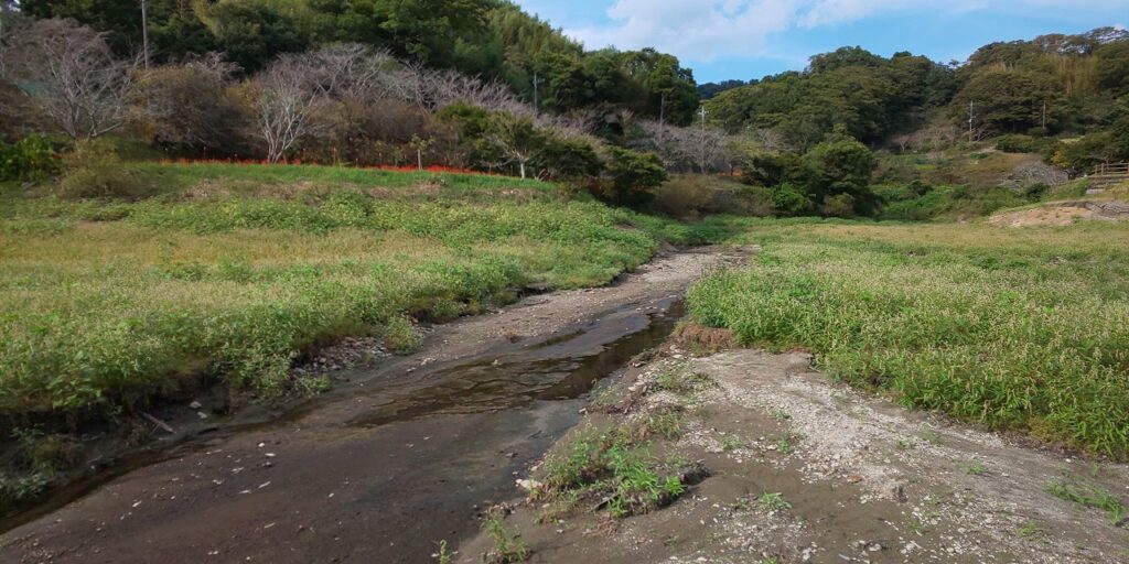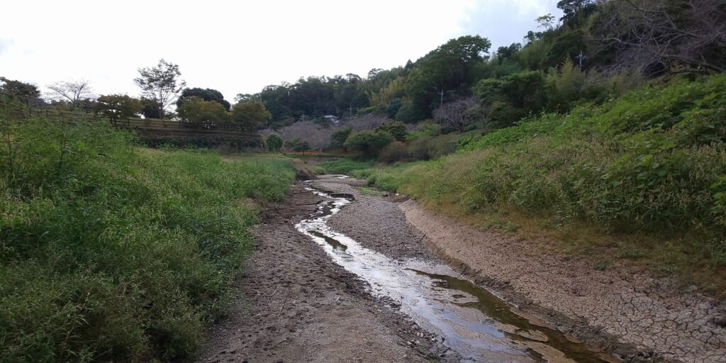 湖底に降り立つと、普段は湖底となっている場所には雑草が生い茂っており、ダムが出来る前の小川の姿が蘇っていました。これだけでちょっと感動します。ただ、これまで湖底であったことから地盤はゆるく、靴がズボッと潜ることが何度かありました。