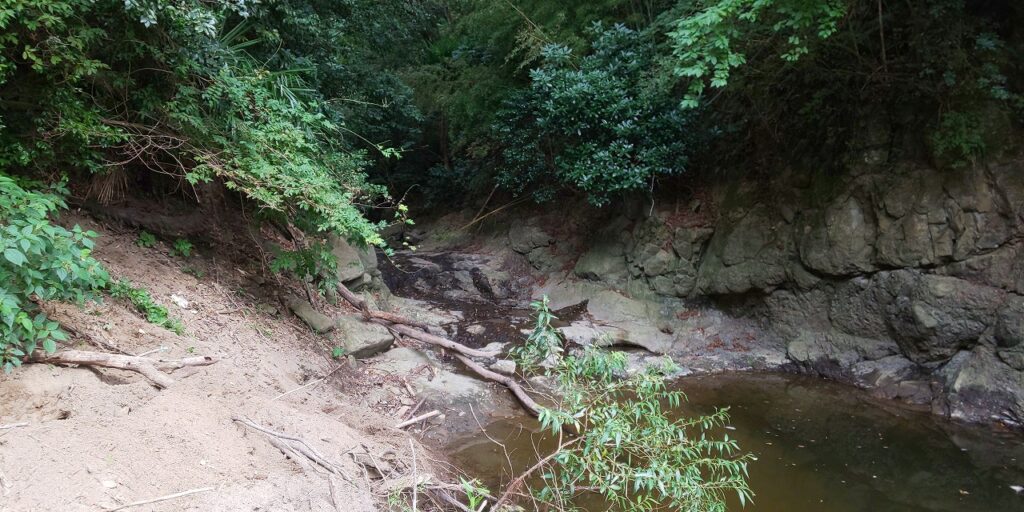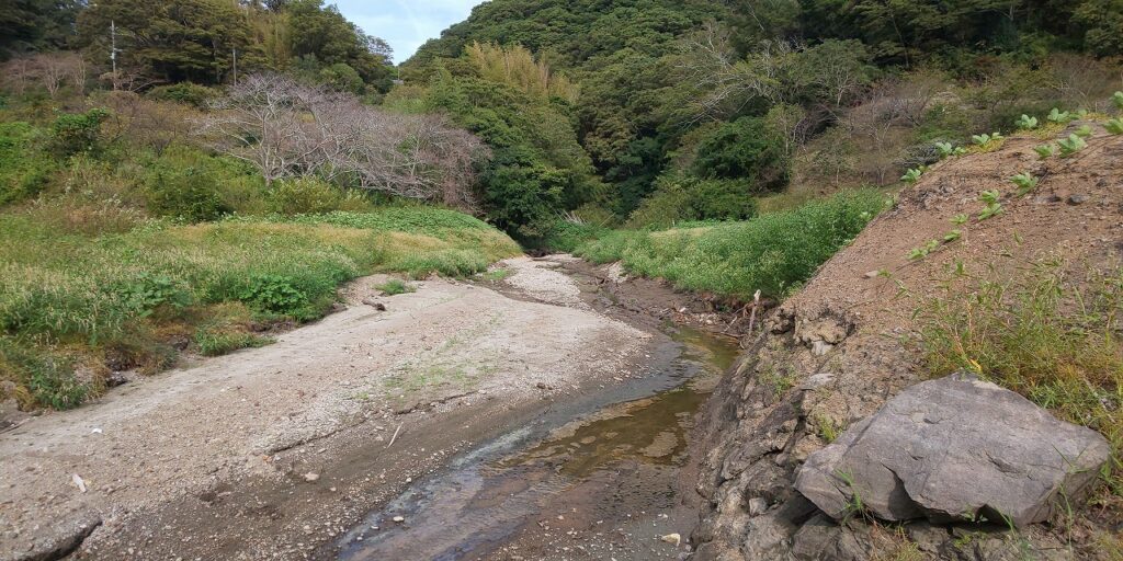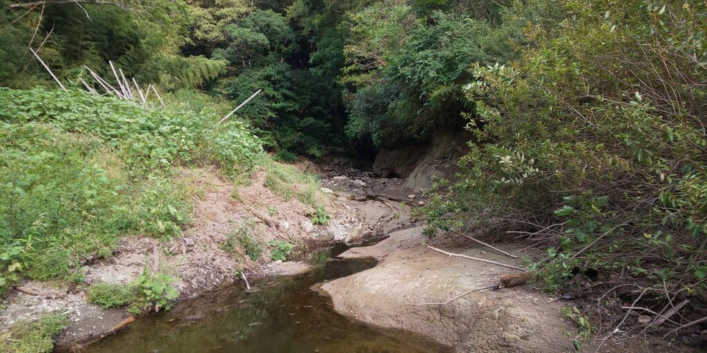 小川に沿って上流側へ歩いて行くと目的地らしき場所が見えてきました。