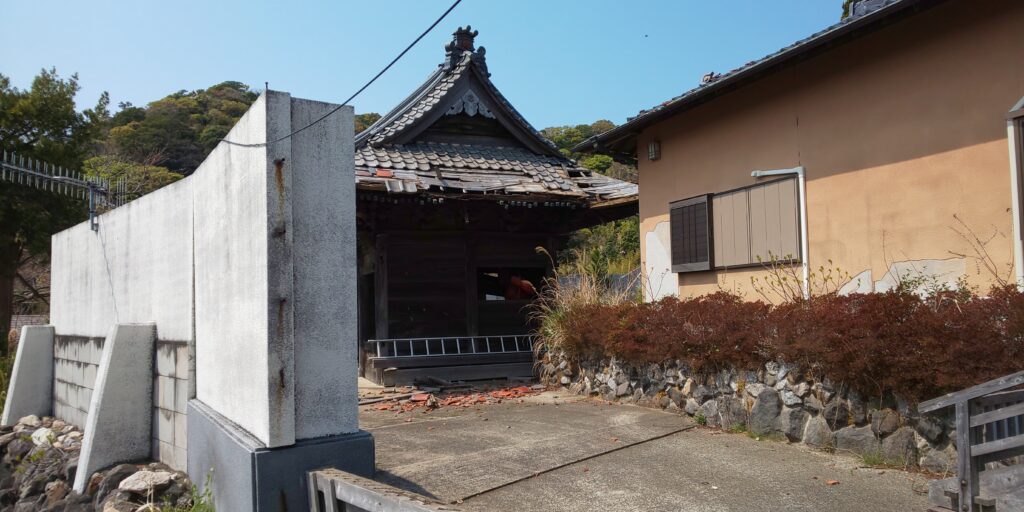 お寺は立派な山門があってちゃんとしているのですが、令和元年の台風により大被害を受けた山門がそのままになり、階段も石を積んで封鎖されていました。住職に話を聞いたところ、少子高齢化で檀家が減って、跡継ぎの決まっている家も半分以下とのこと。こうしたなかで地域の歴史や文化が失われるのは悲しいことです。