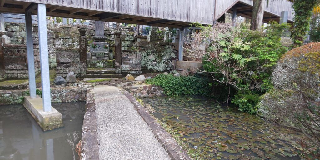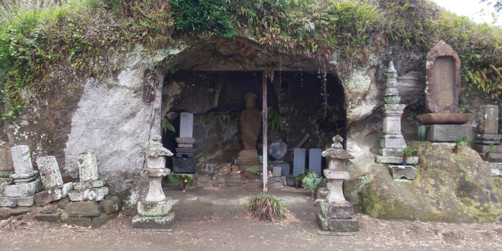 観音堂の脇の岩窟には石仏や宝篋印塔があり、奥の墓地には房州石で組まれたものもありました。