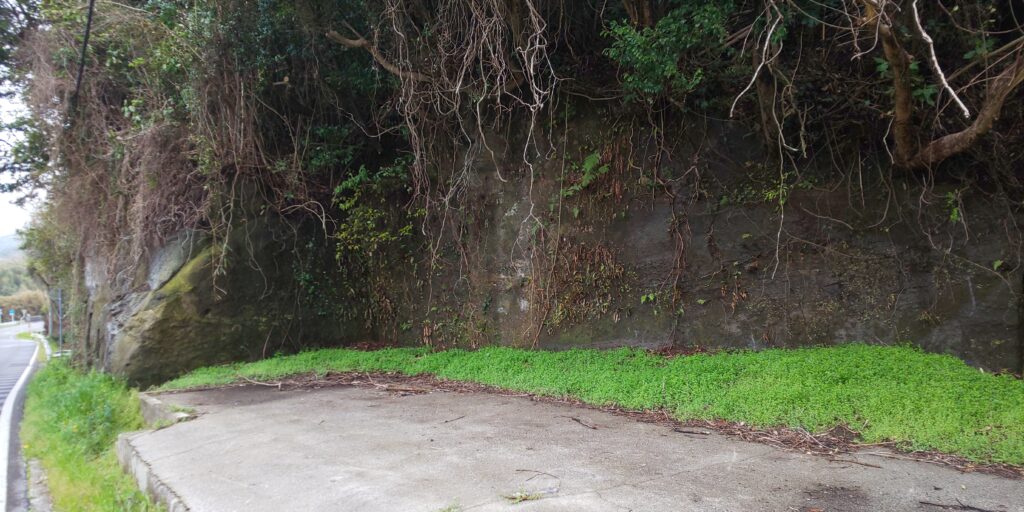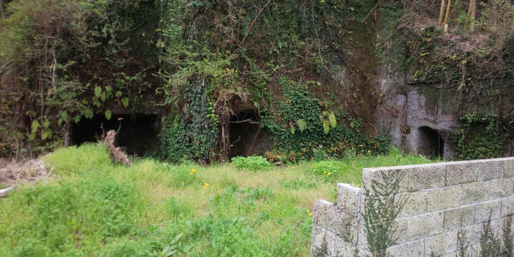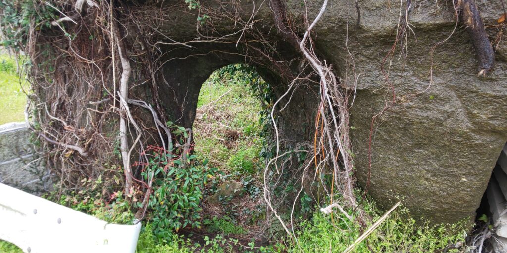 お寺の周りで気になったのは岩盤を削った穴や垂直に作られた石壁、穴へ通じるトンネルなど。中三原での房州石の石切りは、明治末には細々と行われていたと言いますが、その名残のようです。